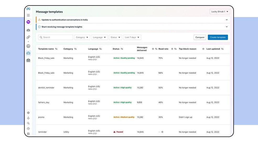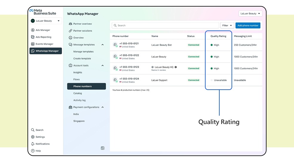 - Monitor Quality Ratings: In WhatsApp Manager, closely track the quality rating, message read rate, and top block reasons for your phone numbers and templates. These are key indicators of user experience health.