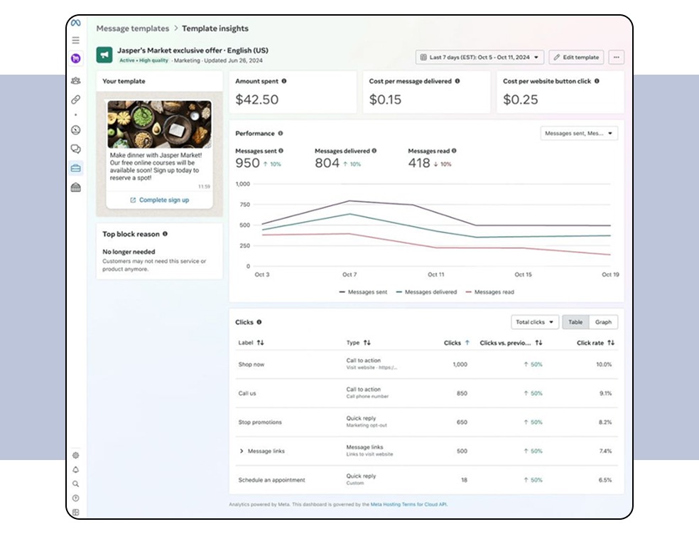 - Deep Dive into Template Insights: Use platform metrics such as messages delivered and button click rates to analyze template performance and understand what content resonates best with your audience.