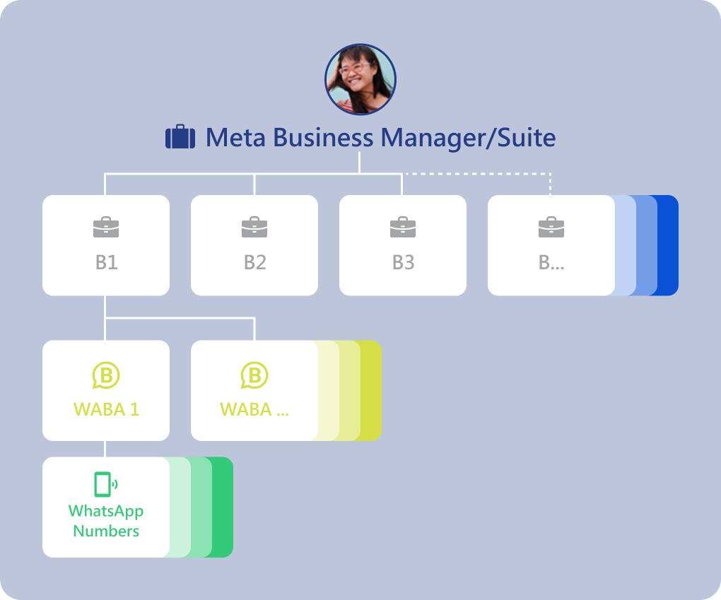 The WhatsApp Business Account is the core of a business’s messaging experience, where all phone numbers, message templates, interactive flows, and product catalog management are handled. A well-designed account structure is essential for efficient operations. A business can create multiple Meta Business Portfolios, each of which can hold one or more WhatsApp Business Accounts, and each account can be configured with multiple phone numbers. However, we strongly recommend that businesses rationally control the number of business accounts, as this helps consolidate data analysis, streamline management processes, and provide customers with a continuous and coherent conversational experience. At the same time, linking your product catalog to your account enables you to send rich messages featuring single or multiple products, enhancing interaction and engagement.